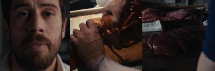 Além disso, a profissão de Sean como chef, voltado a experimentações culinárias, gera cenas que flertam com o grotesco ao mostrar a preparação de carnes cruas e frutos do mar, mortos e dissecados na bancada da cozinha. De modo semelhante, a utilização de primeiríssimos planos, por vezes frontais, pode causar estranhamento, assim como a longa duração de alguns planos, que apostam nos silêncios, nas pausas e na ausência de ação. Isso reforça, novamente, o suspense de Servant. É interessante ressaltar, ainda, que a edição não é inteiramente linear, já que o passado dos personagens e a causa da morte de Jericho – que só é revelada no final da temporada – são contados por meio de flashbacks.