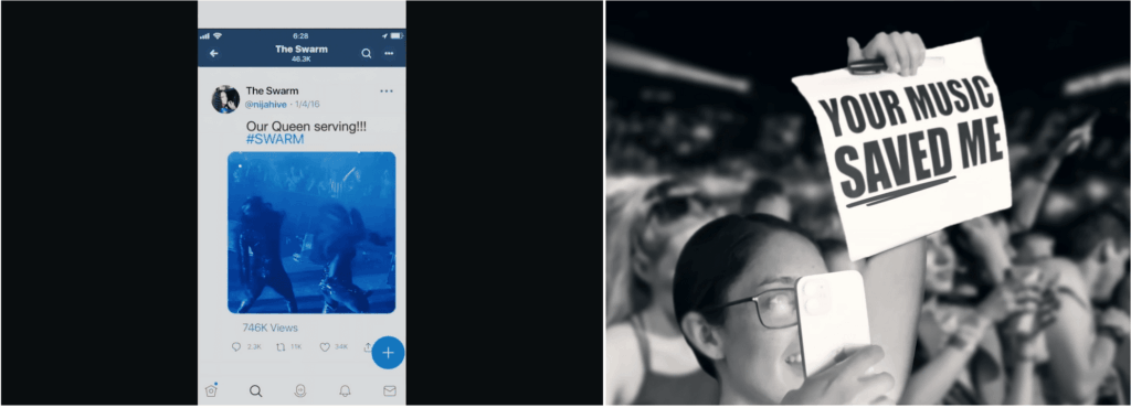 Lançada em 2023, Swarm traz relações com alguns eventos e discussões que a situam num contexto histórico e cultural específico. Após a repercussão ao redor do assassinato de George Floyd por um policial branco nos Estados Unidos, figuras públicas e empresas tornaram-se mais vocais com relação às injustiças raciais no país. Para a Amazon, desenvolvedora da série, ter um lançamento protagonizado e criado por pessoas negras naquele momento era algo mercadologicamente interessante, configurando uma oportunidade tanto de debater o assunto e trazer representatividade, quanto de se beneficiar como uma empresa consciente. Outro ponto relevante para entender as escolhas temáticas da obra é o cenário pós-pandemia de COVID-19, quando grandes eventos puderam voltar a ser realizados, como turnês e shows em estádios. A primeira cena do episódio piloto faz justamente referência à espera em filas virtuais para conseguir um ingresso de show que se esgota em poucos minutos. Essas mega turnês passaram a ser algo comum no mundo da música, dando aos telespectadores uma possibilidade de identificação com Dre a partir da posição de fãs.