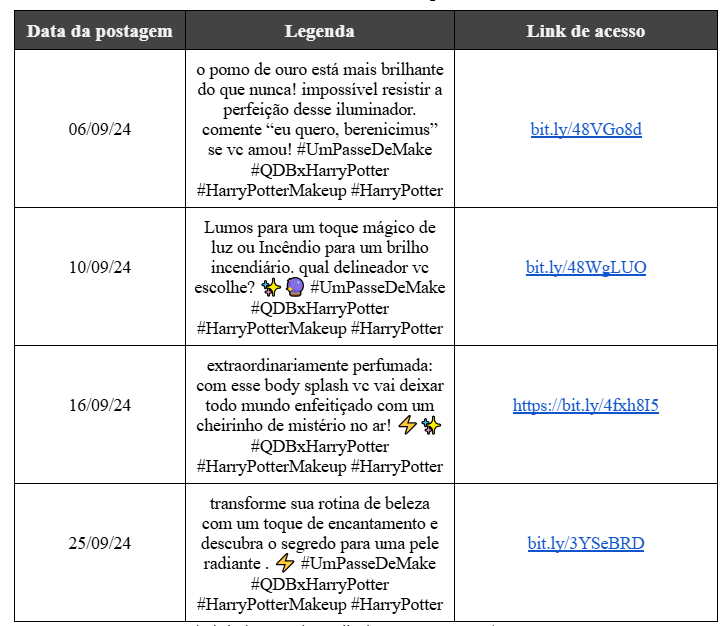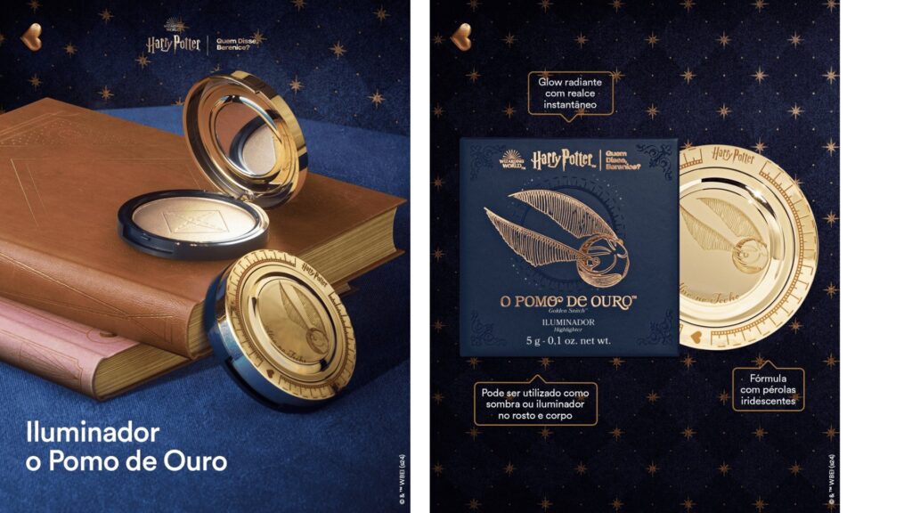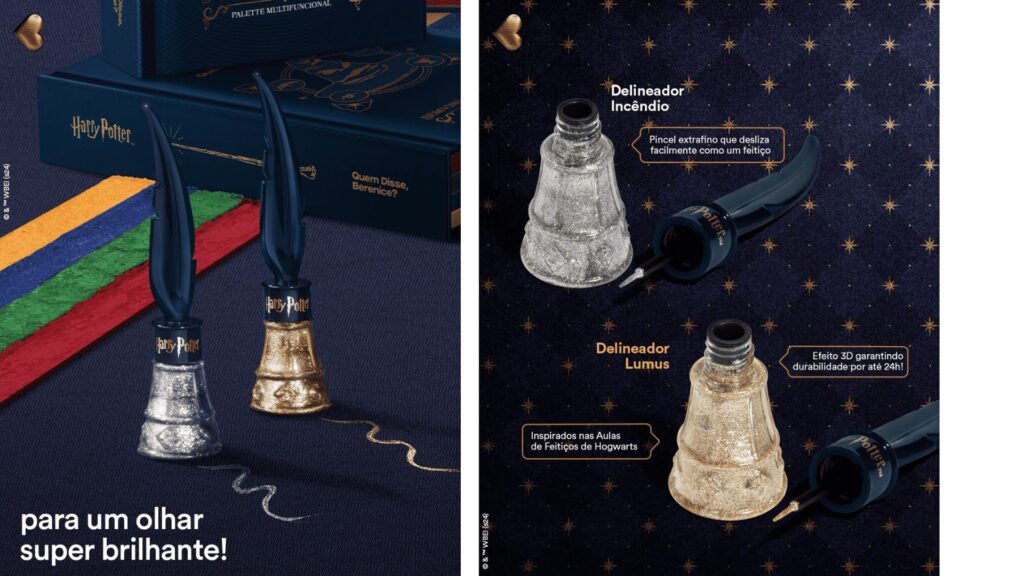 No parâmetro Colecionabilidade e mercantilização observamos que todos os quatro posts selecionados contemplam o indicador, pois os produtos introduzidos além de contarem com nome de feitiços da saga Harry Potter, as suas descrições apresentam ambientações ao universo com uso de palavras como “enfeitiçado” e “mágico”. Além disso, ambos remetem visualmente a elementos já conhecidos como o Pomo de Ouro e a Caneta de Pena. Tal gatilho desperta uma associação nichada, no qual o consumidor fã da franquia muitas das vezes adquire os produtos com uma forma de trazer a magia do universo de Harry Potter para hábitos do cotidiano, como se maquiar ou ao passar um perfume. O simbolismo das embalagens representativas também instiga o colecionismo, uma vez que mesmo sem a necessidade da compra de um delineador, quem adquire o produto como objeto de decoração por sua embalagem chamativa.