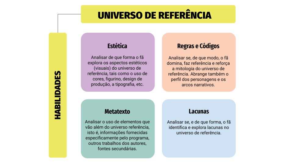 A dimensão do universo de referência é composta por quatro habilidades, são elas: a estética, as regras e códigos, o metatexto e as lacunas.