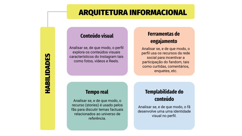 A dimensão da arquitetura informacional é composta por quatro habilidades, são elas: o conteúdo visual, as ferramentas de engajamento, o tempo real e a templabilidade do conteúdo.