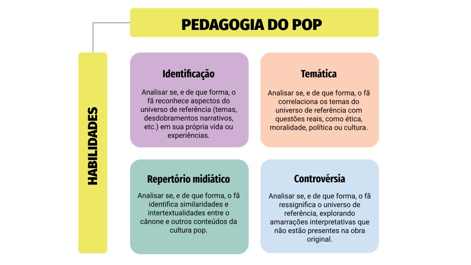 A dimensão da pedagogia do pop é composta por quatro habilidades, são elas: a identificação, a temática, o repertório midiático e a controvérsia.