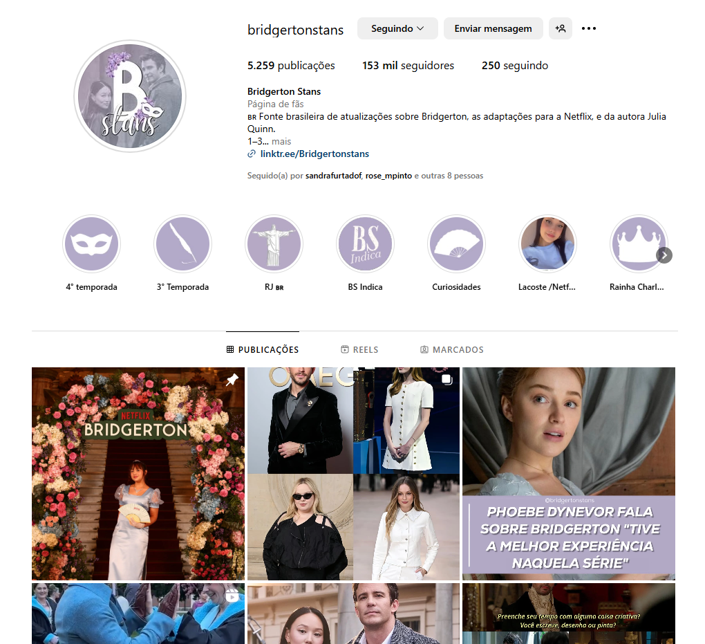 Dessa forma, o perfil Bridgerton Stans não apenas compartilha informações, mas realiza um trabalho de curadoria mediada por critérios editoriais claros e por um uso estratégico das ferramentas do Instagram. Sua atuação reflete, em muitos aspectos, o exercício jornalístico, ao selecionar, organizar e divulgar conteúdos com o objetivo de informar, engajar e fortalecer a comunidade de fãs.