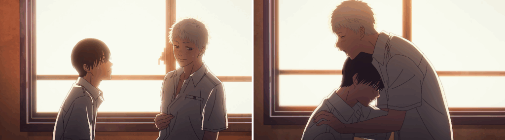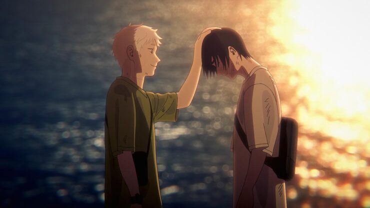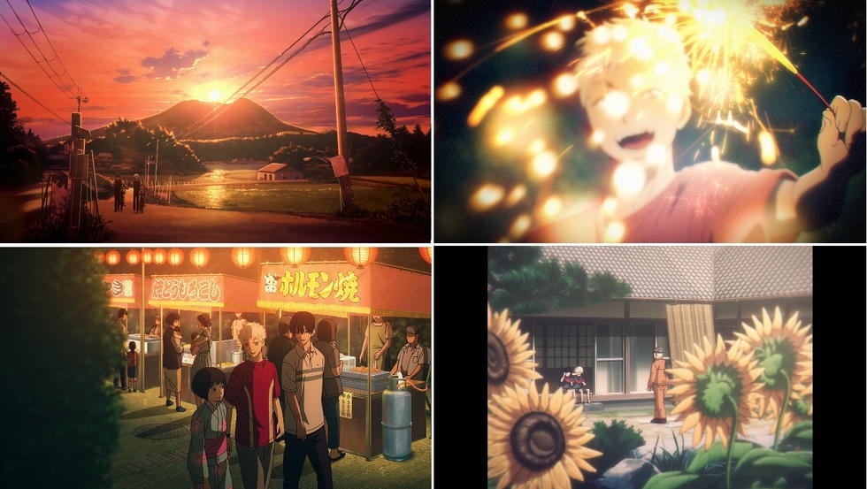A fotografia recorre, em inúmeras cenas externas e diurnas, a tons alaranjados, o que remete, novamente, ao verão, à luz solar e ao calor. Esses tons estão presentes, também, em algumas cenas noturnas que perpassam momentos de diversão, como quando os meninos brincam com senko hanabi – um tipo de fogo de artifício portátil, que pode ser segurado e fica aceso por alguns segundos – ou quando passeiam pelo festival de verão da cidade. No entanto, cenas noturnas na montanha onde Hikaru se perdeu, por exemplo, apresentam tons frios, que não somente representam a ausência de iluminação, mas também o caráter sombrio daquele local. É válido pontuar, ainda, como a resolução da imagem muda quando há flashbacks que remontam à infância de Hikaru e Yoshiki, mesmo que não sejam necessárias indicações que apontem a troca de temporalidade, uma vez que a aparência infantil dos meninos já explicita que a cena ocorre no passado. Ou seja, a opção pela mudança de resolução parece ser uma escolha estética mais do que uma seta chamativa para explicar didaticamente a temporalidade ao público.