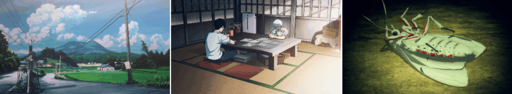 A primeira parte da análise do animê centra-se no plano da expressão, a partir do qual são avaliados elementos como ambientação, fotografia, edição e trilha sonora. Como pontuado, a história se passa em uma vila rural, permeada por montanhas. Desse modo, predominam os cenários naturais, mesclados às pequenas casas e construções do vilarejo, que trazem elementos da arquitetura japonesa. Exemplos são os washitsu, cômodos de estilo tradicional, com pisos de tatame e painéis fusuma, que funcionam como divisórias ou portas deslizantes. Além disso, devido ao cenário rural, a trilha sonora traz, com constância, o canto das cigarras como som de fundo, somado a planos que mostram diretamente esses animais. Contudo, as cigarras não apenas representam essa ambientação, mas também a época em que a maior parte da narrativa se desenvolve, dando o nome ao título: o verão. Isso porque, no Japão, o som das cigarras é forte nessa época do ano, transformando-as em um símbolo da estação. Tal associação pode ser observada, com frequência, em outras obras japonesas, como em Quando as Cigarras Choram, um jogo estilo visual novel que foi adaptado para mangá e animê.