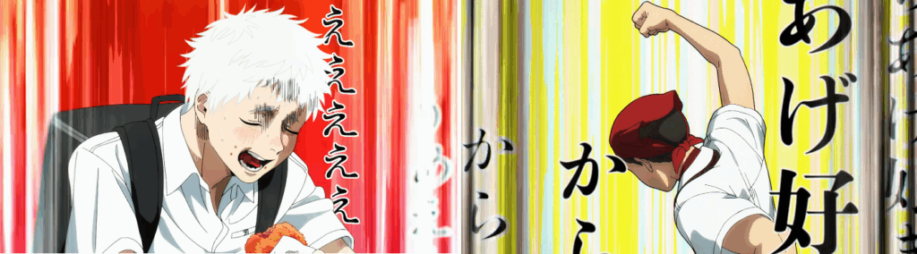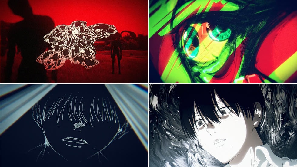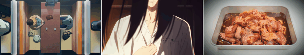 Além disso, é importante ressaltar a escolha de alguns planos e modos de edição, que trazem características estéticas próprias ao animê, ao mesmo tempo em que contribuem para ressaltar o caráter de estranheza ou comicidade de determinadas cenas. É o caso dos planos paralelos ao chão, que retratam as cenas de cima – um recurso que, em outros animês ou mesmo em séries, não é comumente utilizado na representação de diálogos e ações, especialmente em ambientes fechados. O animê também opta por planos em primeira pessoa, mostrando o ponto de vista de Yoshiki. Há, ainda, a utilização de imagens e vídeos reais mesclados à animação, como é possível observar em determinadas cenas e na vinheta final. Tais escolhas estéticas podem reforçar a estranheza e o horror ao trazerem ângulos incomuns, que escondem o rosto e as expressões dos personagens, além de trechos que quebram as regras diegéticas ao mesclar animação e “realidade”.
