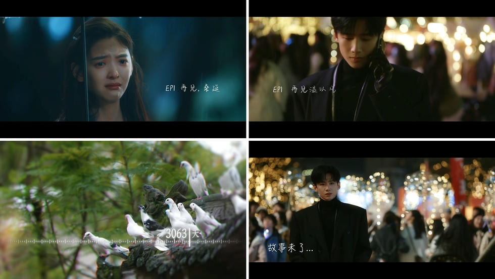 Além disso, o grafismo é utilizado no início dos episódios para sinalizar os dias decorridos, sendo o primeiro dia aquele em que os protagonistas se encontraram pela primeira vez no ensino médio. Também serve como recurso para sinalizar o nome do episódio, como no primeiro: “Adeus, Sang Yan. Adeus, Wan Yi Fan”. No entanto, durante o flashback do início do episódio em que Yi Fan afasta Sang Yan de sua vida, aparece apenas “Adeus,Sang Yan”, e o ponto de vista de Sang Yan finaliza com o grafismo que complementa a cena anterior: “Adeus, Wan Yi Fan”. É interessante notar que, na cena inicial e final, é inserido um recurso de faixa preta nas partes superior e inferior da tela. A cena começa com as faixas, que somem após o flashback, funcionando como uma abertura para o desenvolvimento do plot. Elas retornam após as cenas finais do ponto de vista de Sang Yan, ressurgindo com o grafismo “a história ainda não acabou”.